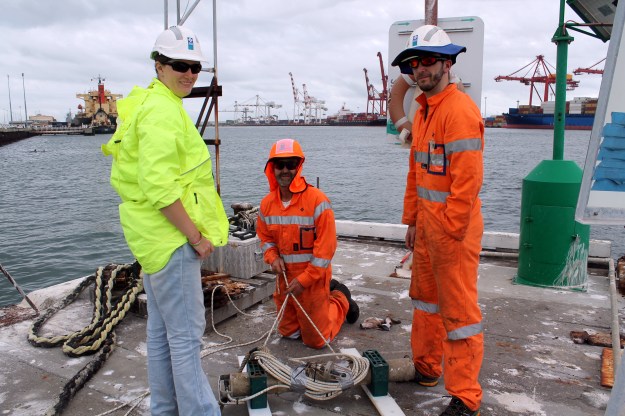 Deploying acoustic recording equipment with help from Fremantle Ports. Spot the dolphins in the background! (Photo: Jeanette Murray)